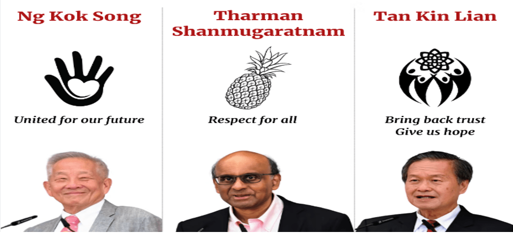 从下述竞选人标识和口号的总结中可以看出,其他两位候选人选择的都是比较常规的符号。其中黄国松先生的符号是五指和心,代表五个民族的和谐。陈钦亮先生的符号是四个人拥抱一朵花,同样代表民族和谐。而据不完全统计,菠萝或者其它水果从来没有被用在政治选举中,尤其是总统选举这个级别😀。