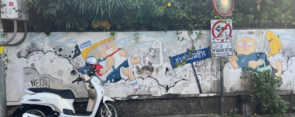 自由散漫的行程得到全家人的喜爱,尤其是小儿子。小儿子是个艺术青年,热爱音乐,喜欢涂鸦。清迈这个小城市,涂鸦遍布,很是可爱。 涂鸦反应了泰国城市治理的松散抑或是宽容,倒是同泰国自由的形象吻合。涂鸦也折射着泰国的 Sanuk 文化,意即人们喜欢幽默,时刻在生活中寻找乐趣。