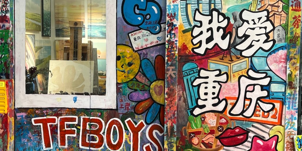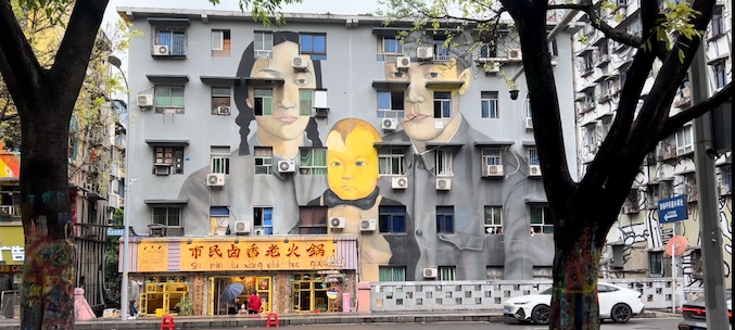 哦,还有四川美院的涂鸦街和小画廊。四川美术协会对面楼的这幅作品,实在让人惊艳。